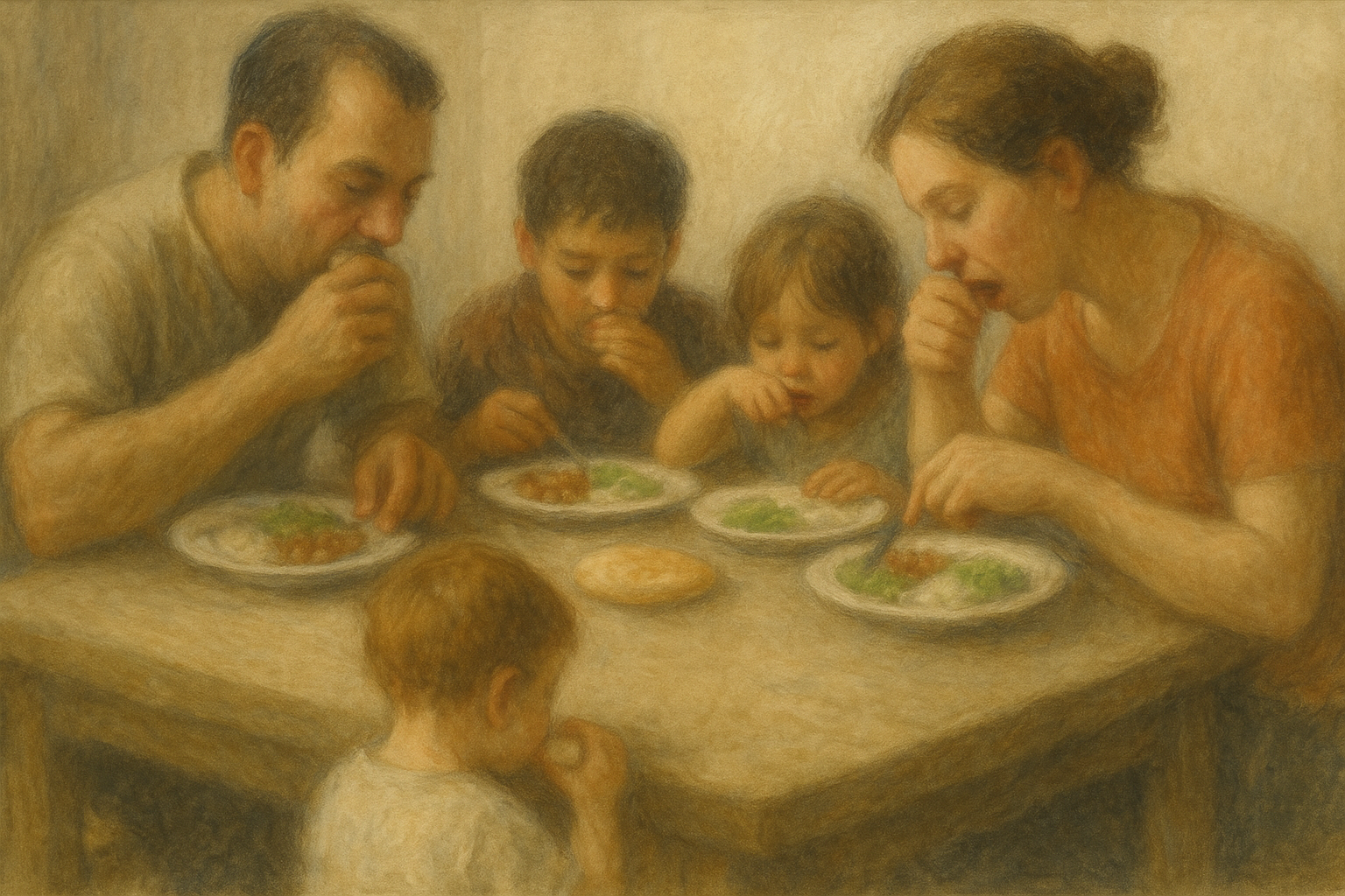 Ellos comían vorazmente, un padre, una madre y sus tres pequeños hijos.